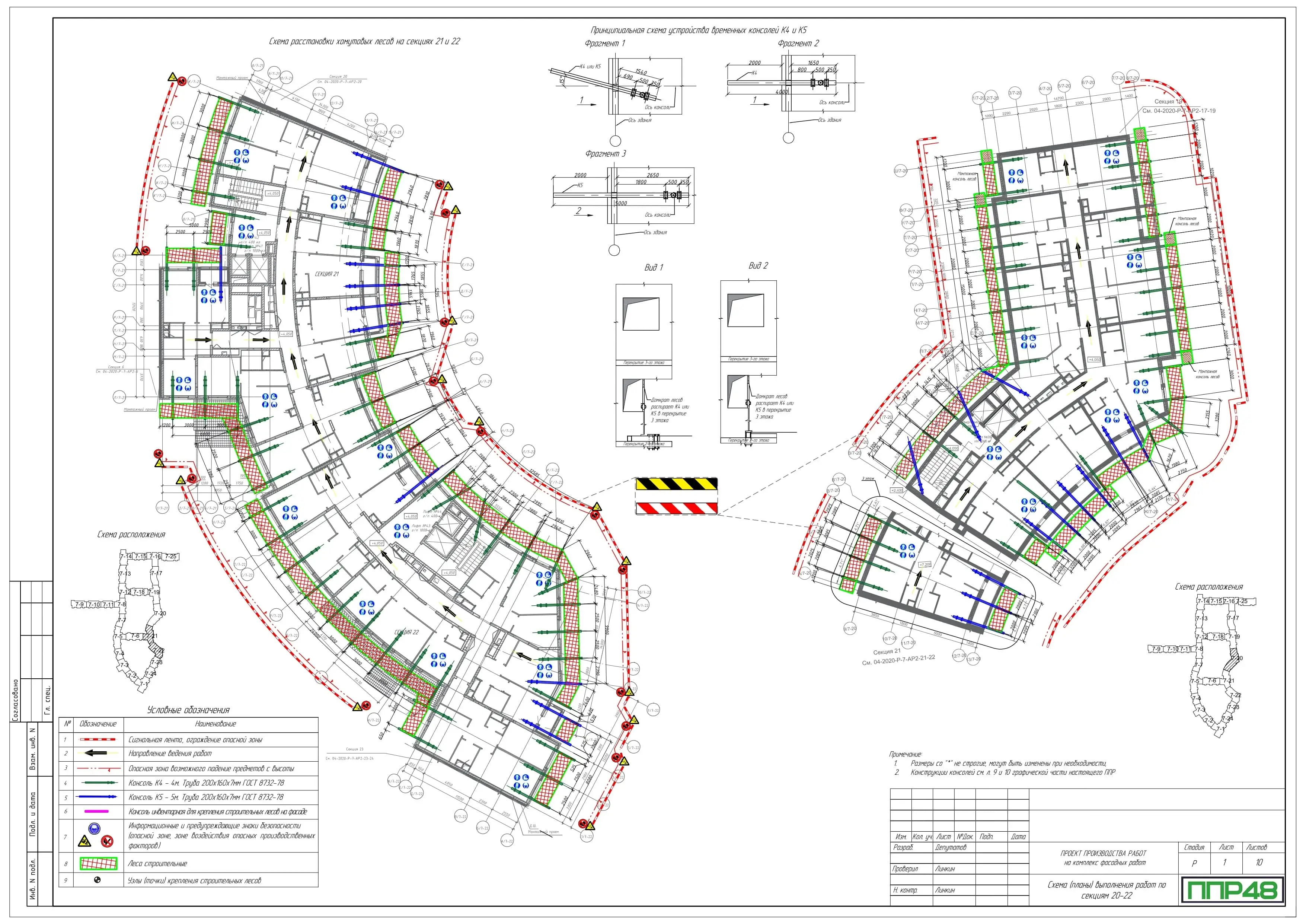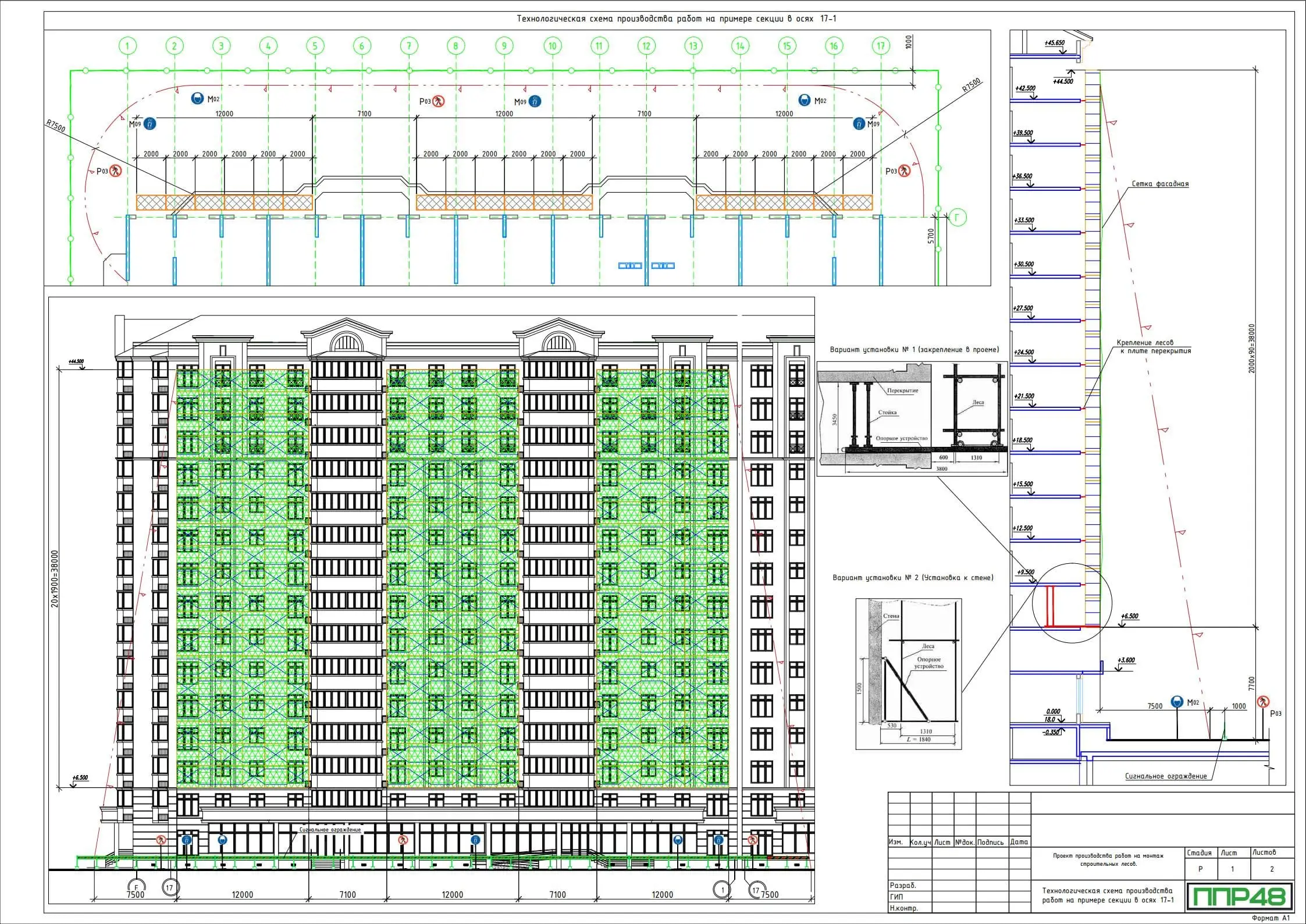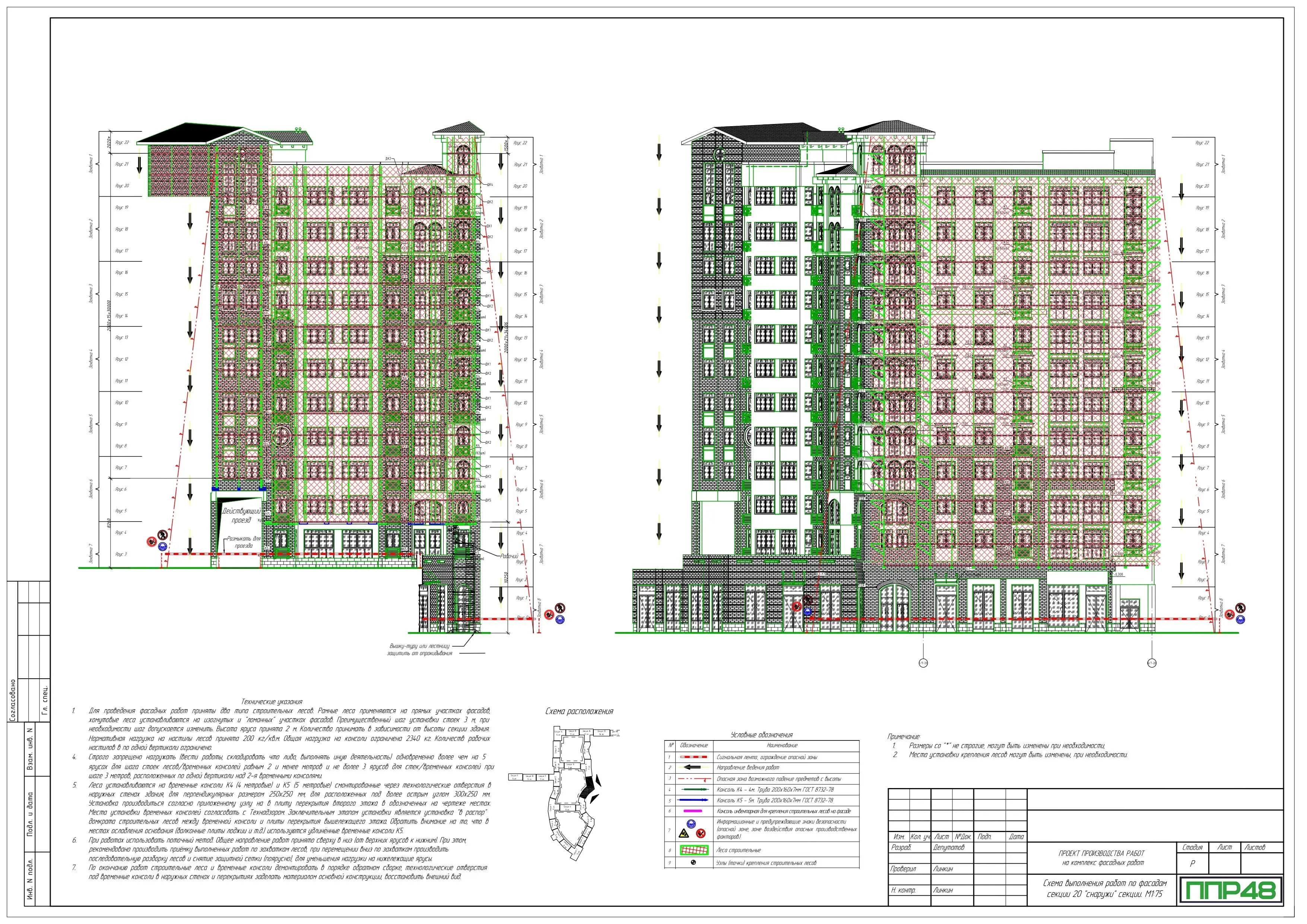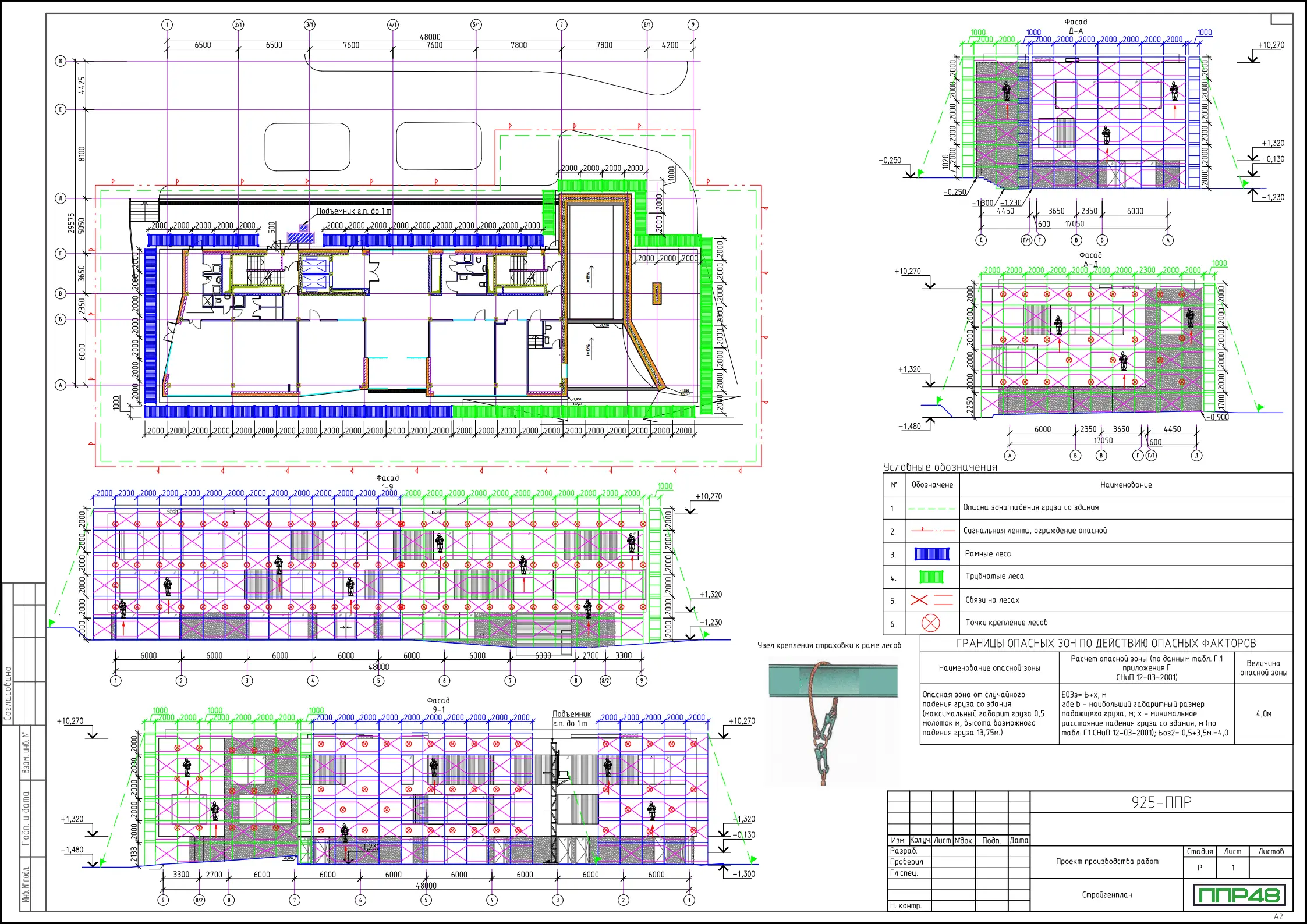 ППР на хомутовые леса — описывает порядок установки/демонтажа, использования хомутовых лесов. Кстати хотелось бы отметить что эти леса - словно пластилин в руках строителей. Ничего не остается кроме как восхищаться конструкцией этих лесов. С их помощью можно выполнять работы на фасадах самых необычных, сложных и причудливых форм. Именно поэтому разработка ППР на данный тип лесов может стоить дороже чем для других типов лесов, например рамных. Специалисты ППР48 в обязательном порядке включают в состав проекта подробные и понятные чертежи, технологические карты, инструкции по охране труда. Также наши проекты содержат указания для эффективного выполнения работ на высоте, в полном соответствии нормативным требованиям.