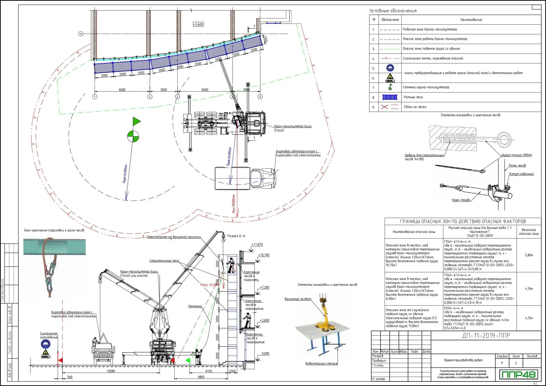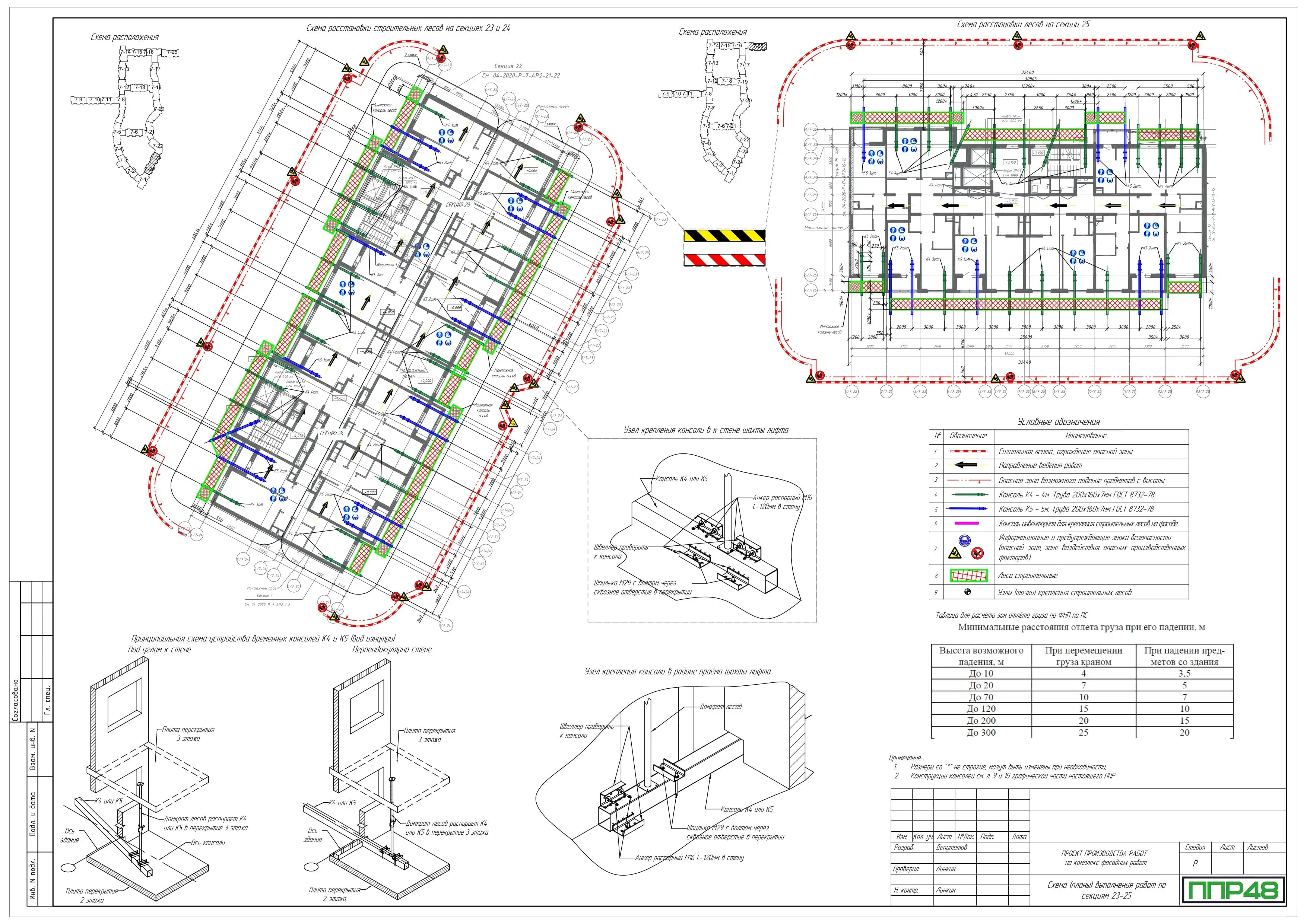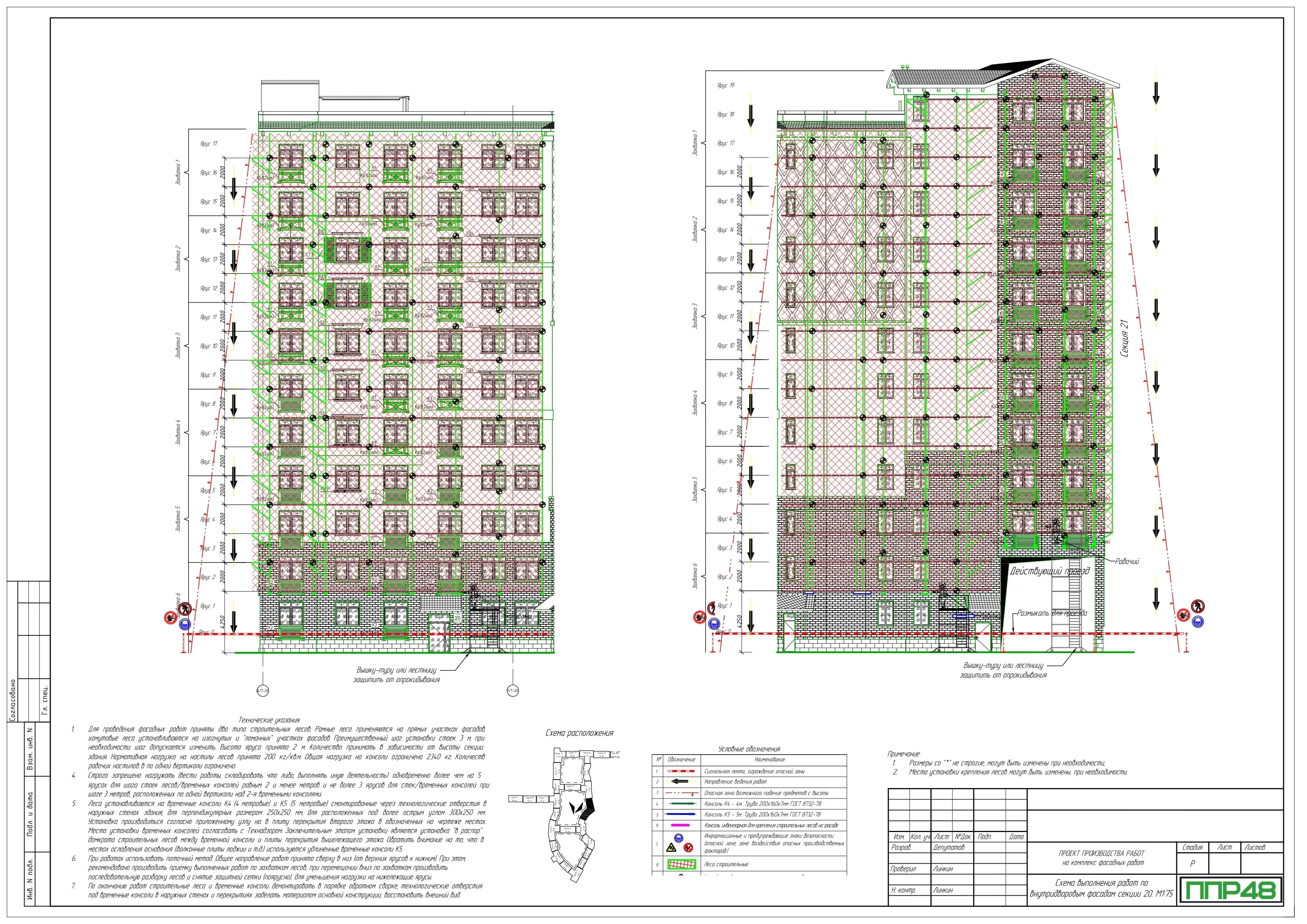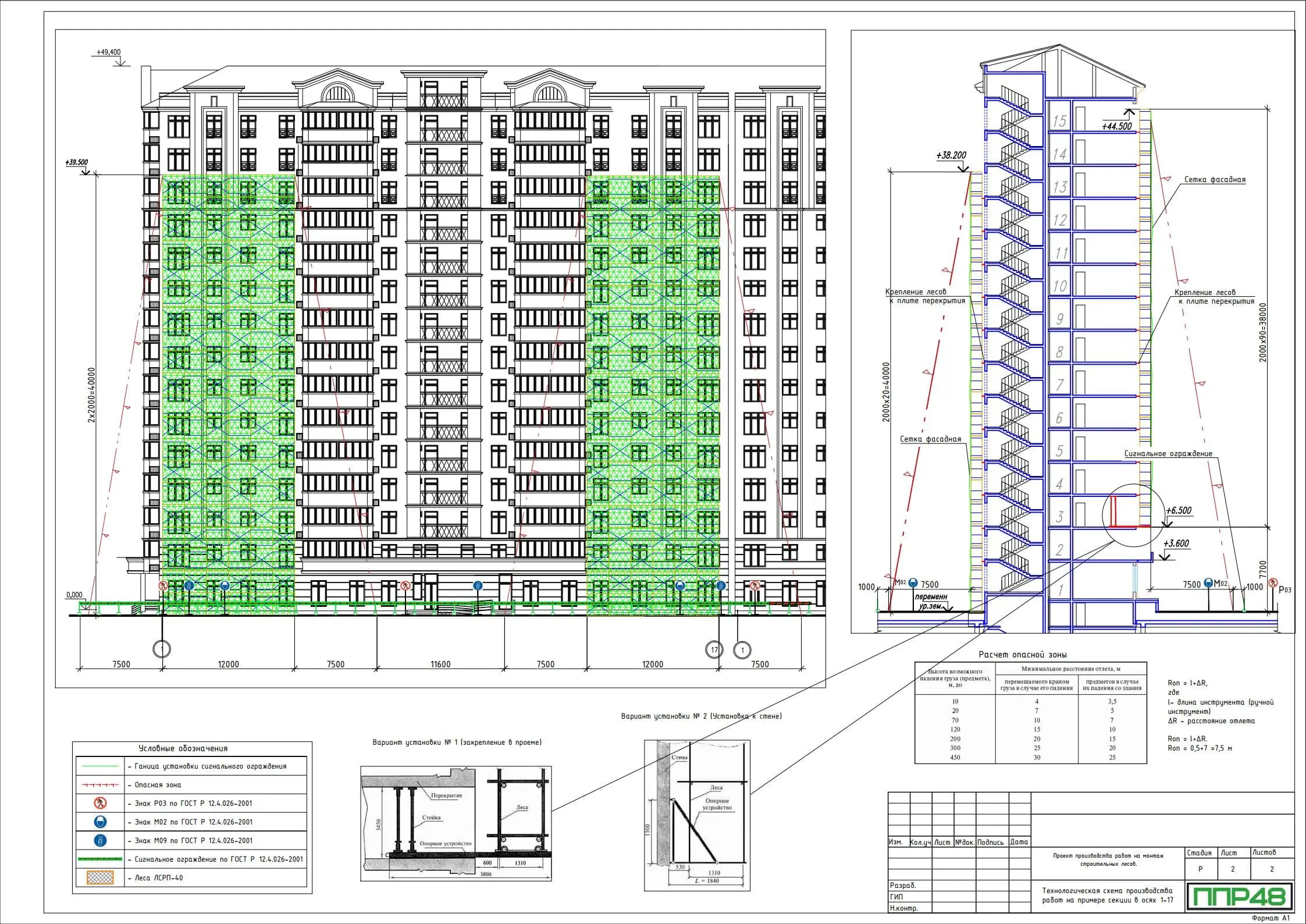 ППР на хомутовые леса — описывает порядок установки/демонтажа, использования хомутовых лесов. Кстати хотелось бы отметить что эти леса - словно пластилин в руках строителей. Ничего не остается кроме как восхищаться конструкцией этих лесов. С их помощью можно выполнять работы на фасадах самых необычных, сложных и причудливых форм. Именно поэтому разработка ППР на данный тип лесов может стоить дороже чем для других типов лесов, например рамных. Специалисты ППР48 в обязательном порядке включают в состав проекта подробные и понятные чертежи, технологические карты, инструкции по охране труда. Также наши проекты содержат указания для эффективного выполнения работ на высоте, в полном соответствии нормативным требованиям.
