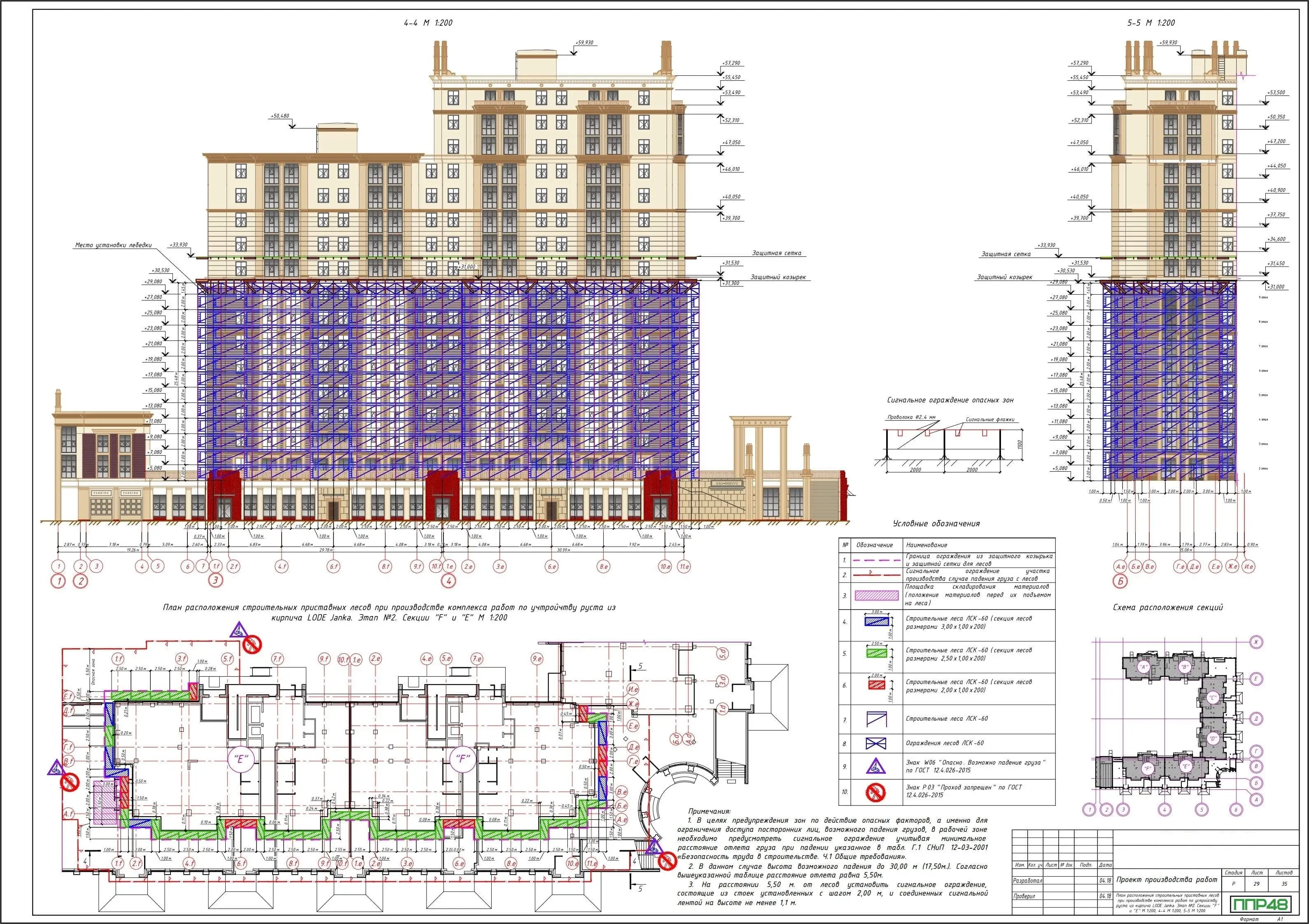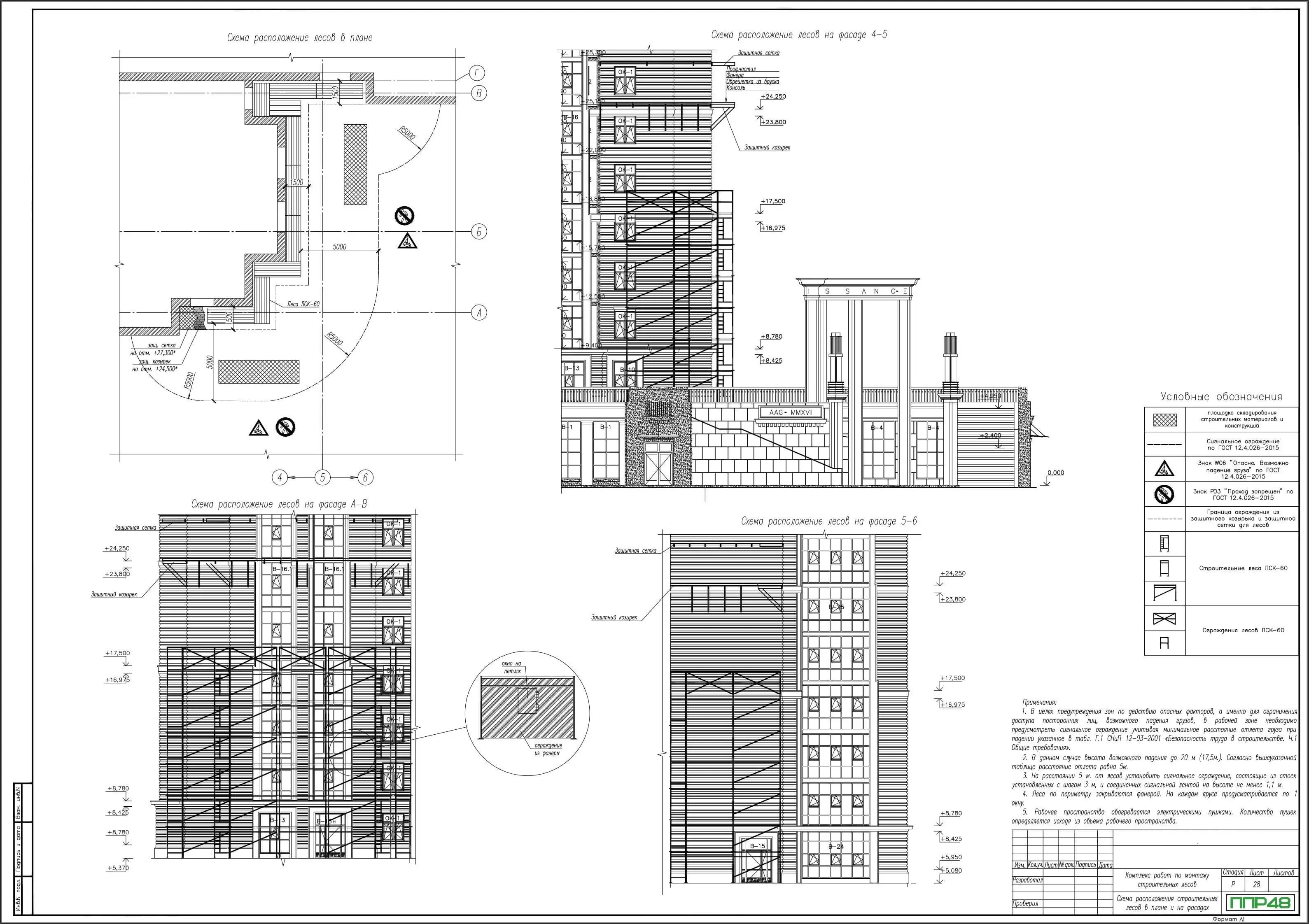 В графической части проекта мы указываем расстановку выбранного типа лесов как на планах, так и на разрезах. В практике нашей компании были случаи, когда кроме монтажных схем установки лесов, нам приходилось выполнять специализированные расчеты на устойчивость и прочность как самих лесов, так и конструкций на которые они устанавливались или к которым они крепились (консольное защемление/установка на стеклянные козырьки и т.д.) Для выполнения простых расчетов специалисты нашей фирмы используют МДС 12-25.2006. Для выполнения более сложных расчетов мы используем специальные программные комплексы, например Lira.